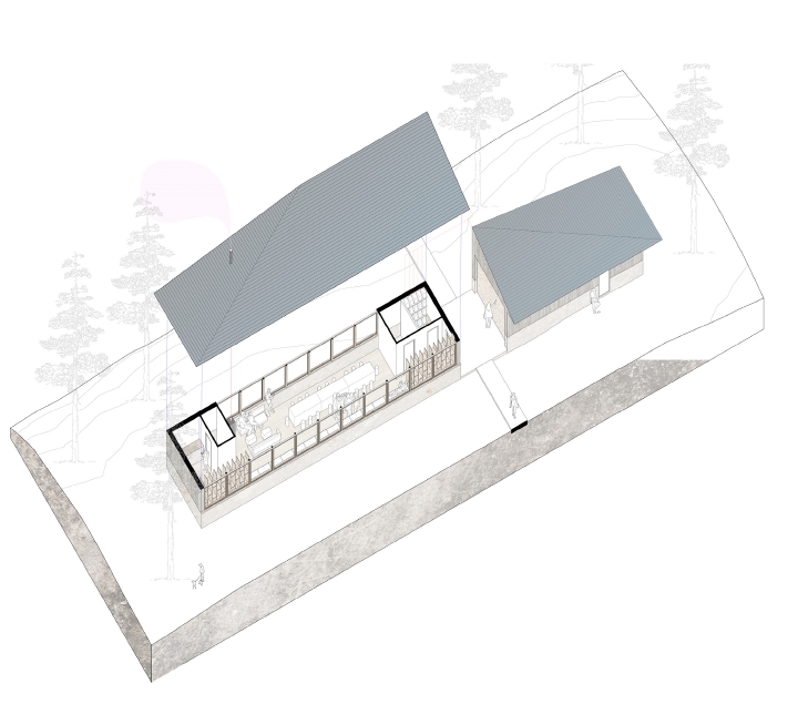 The building design is very translucent with door-to-ceiling windows and the retreat`s ecological approach is underlined through invisible solar panels on the roof. Next to the dining hall is the Caribou bathhouse with its bathrooms for the treehouse guests and a utility room for laundry, cleaning and storage.