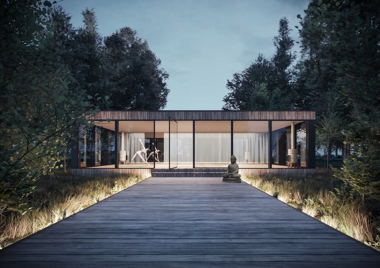 Nestled on the edge of the private island a large and contemporary designed dining pavilion is the central meeting point of the island retreat where guests will meet, laugh and enjoy the local Swedish dishes. The heart of the pavilion is the huge dining hall with its cozy lounge area by the fireplace. It opens up to an outdoor seating area which offers its guests beautiful views on the lake in summertime. From the farms nearby Swedish delicacies of the current season will be served such as freshly caught fish, game or hand-picked berries from the surrounding forests.